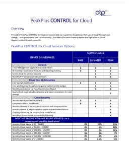 PTP’s PeakPlus CONTROL™ for Cloud services enable our customers to optimize their use of cloud through cost savings, Cloud governance, and Cloud security. Our offers are constructed to deliver the right level of Cloud support needed by each customer. The chart below shows monthly pricing with AWS billing services as a percentage of monthly cloud spend.