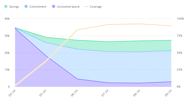 The RI program was implemented at the end of April 2024 and has reduced EC2 spend 53% through September 2024. The RI program has achieved 89% coverage across EC2 and SageMaker since April, providing the flexibility to adapt while simultaneously reaping cost savings through their refined processes.