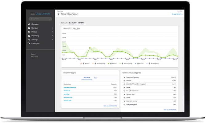 Cisco Umbrella provides the first line of defense against threats on the Internet, wherever users go.