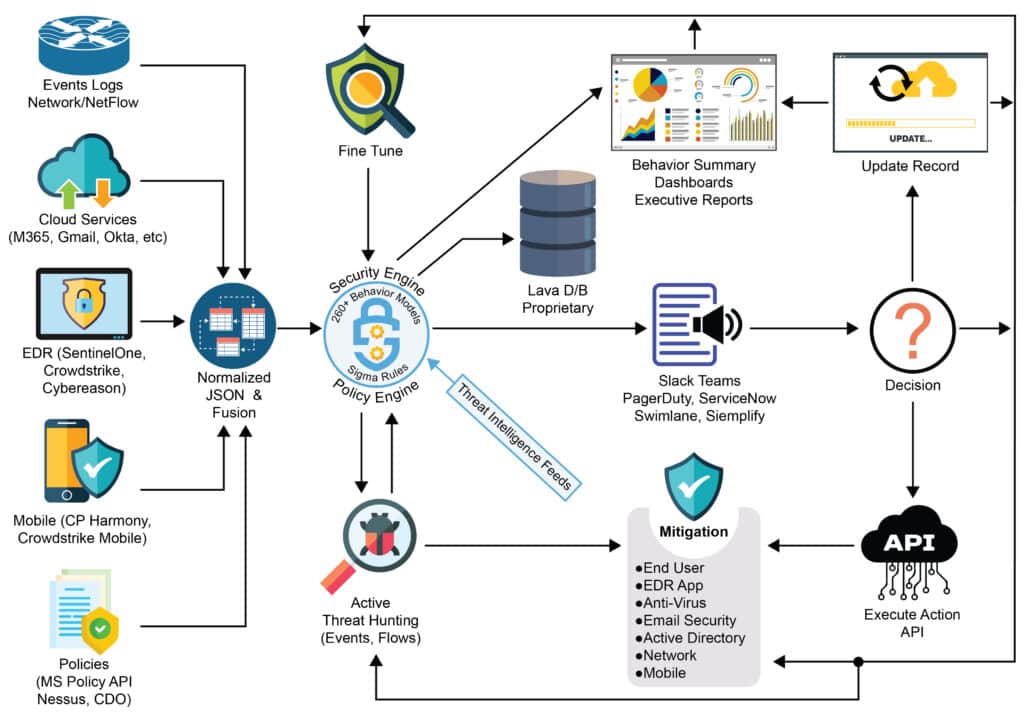 SIEMs (Security Information and Event Management) have been around for quite a while. Early versions of SIEMs were created in large part to address log management and storage requirements from the Payment Card Industry Data Security Standards (PCI DSS). These systems could parse logs from servers, firewalls and other devices and could provide retention of those logs, reporting of what was retained, and with some struggle, they could allow Security Operations Center (SOC) teams to search the logs. Newer versions, or Next Generation SIEMs, have improved the parsing of disparate logs, include faster databases for searching, archive older logs and have included rule sets and machine learning (ML) for the correlation of logs and the evaluation of indicators of compromise (IOCs). PTP leverages Fluency Security for our SIEM platform for a number of significant reasons that include: parsing ability, threat hunting, speed of searches, extensive rule set for ML, ability for API integration and working relationship with Fluency leadership. The image below outlines the workflow of Fluency from receipt of logs and data from datasources through it’s process of making decisions on events becoming security incidents.