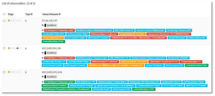 As seen in these images, tagging is heavily utilized to make sense of the data by pulling things together and increasing the visibility of important factors. The power of this feature combined with workflow automation is very apparent when dealing with lists of IP addresses from incident investigations. The data in the image below represents the results of triggering the automated tasks against a list of addresses. This workflow completed 24 searches against disparate sources for each IP address in the list within a couple of minutes and provides highly visible feedback to the analyst about them.